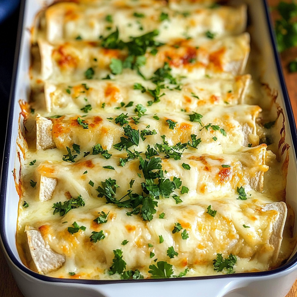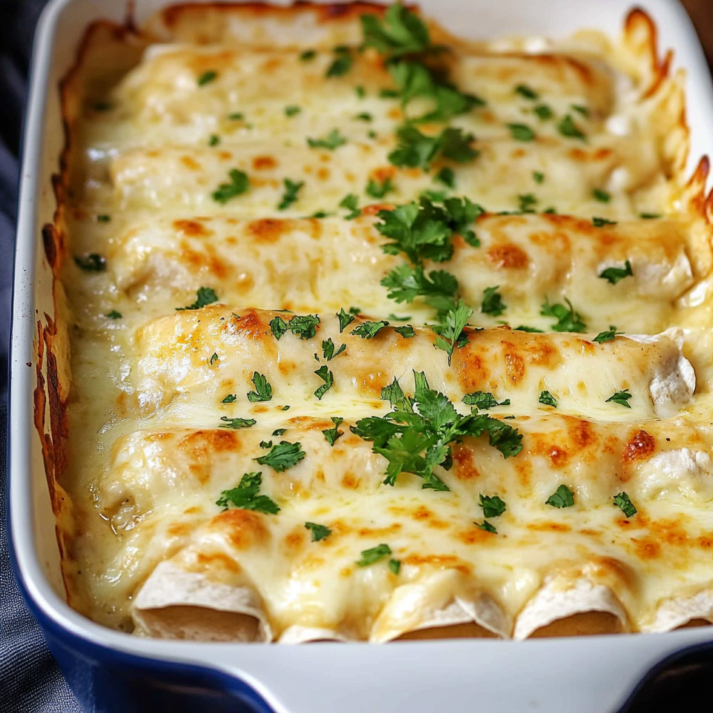 Creamy White Chicken Enchiladas are tortillas filled with shredded chicken, cheese, and a rich cream-based sauce, then baked until bubbly.