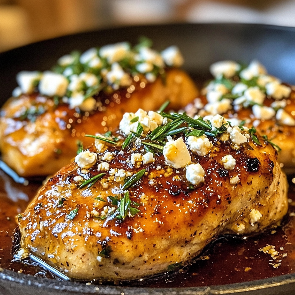 - Transfer the chicken to a baking dish, pour the glaze over it, and top with crumbled feta and rosemary.