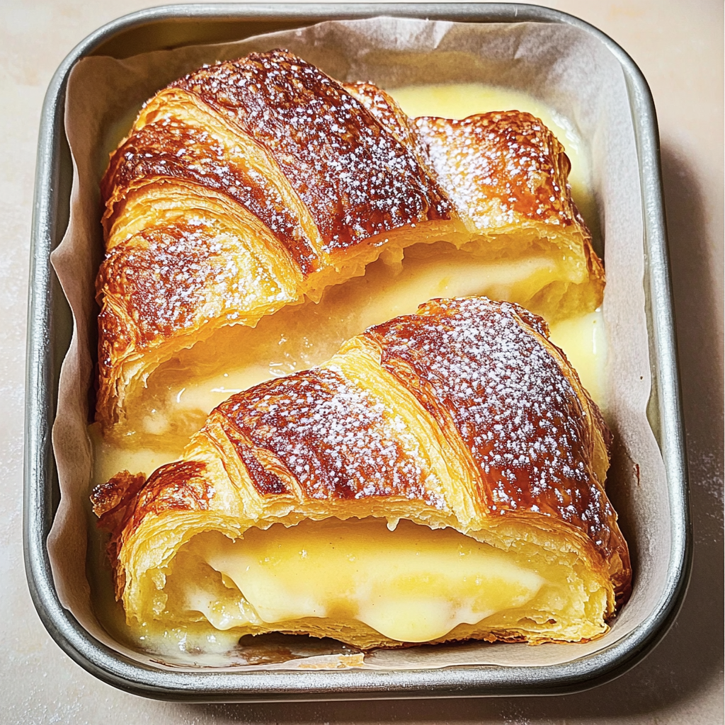Lemon and custard croissant pudding is a delicious dessert made from layers of croissants soaked in lemon-flavored custard, baked until golden.