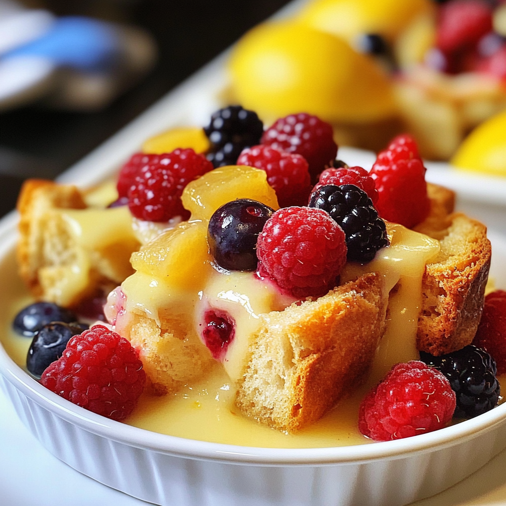 Lemon Berry Bread Pudding is a dessert made with bread soaked in a lemony custard mixture and layered with fresh berries. It’s baked until golden and served warm.